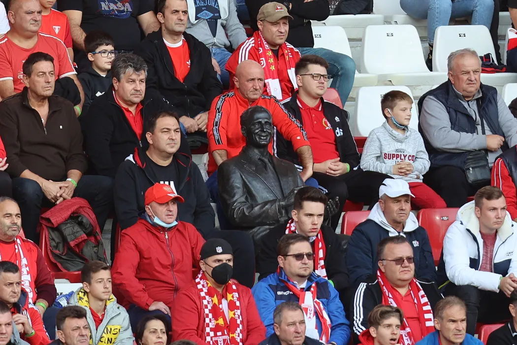 Statuia Baronului Francisc Neuman, fondatorul echipei UTA, poate fi vazuta in tribuna in timpul meciului dintre echipele UTA Arad si FC U Craiova din etapa a XI-a a Ligii 1, disputat pe stadionul Francisc Neuman din Arad, duminica, 17 octombrie 2021. CIPRIAN PETCUT / MEDIAFAX FOTO