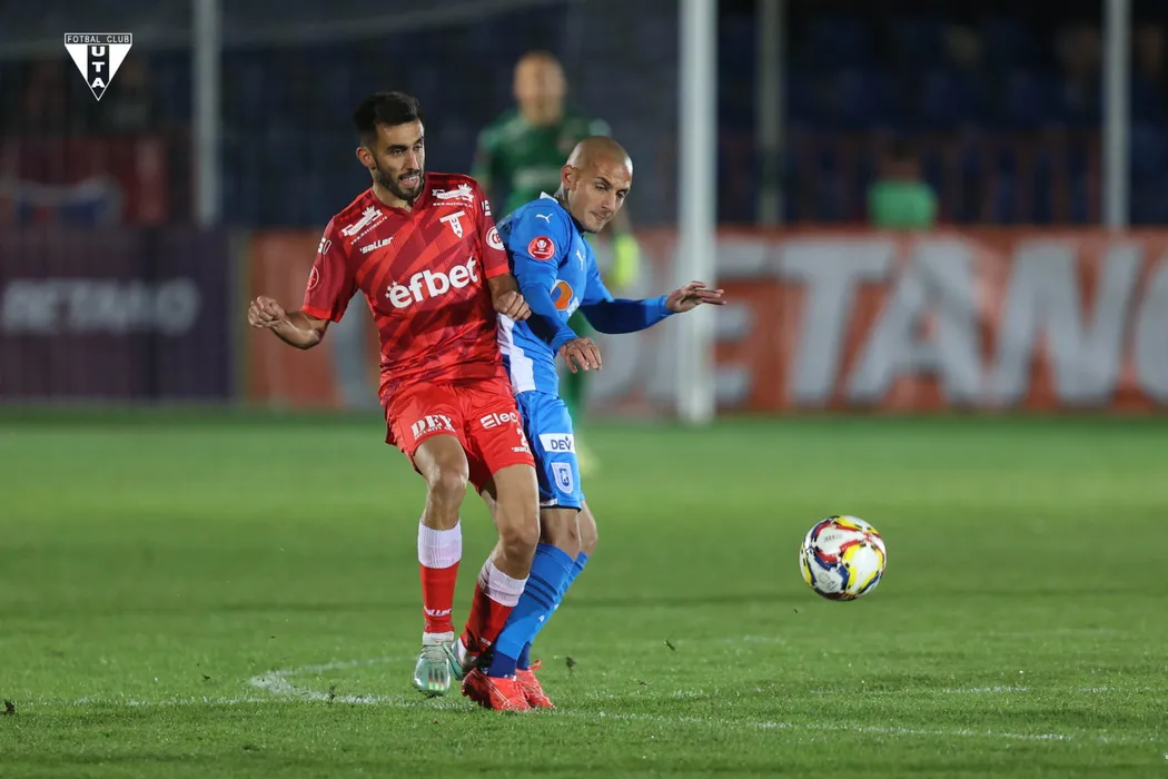 Diogo Miguel Costa Rodrigues și Ionuî Alexandru Mitriță în meciul de fotbal dintre UTA ARAD si UNIVERSITATEA CRAIOVA, contând pentru CUPA ROMÂNIEI BETANO, desfășurat pe Stadionul "Iuliu Bodola" din Oradea, miercuri 01 noiembrie 2023. © FOTO:Ciprian PETCUT/SPORT PICTURES