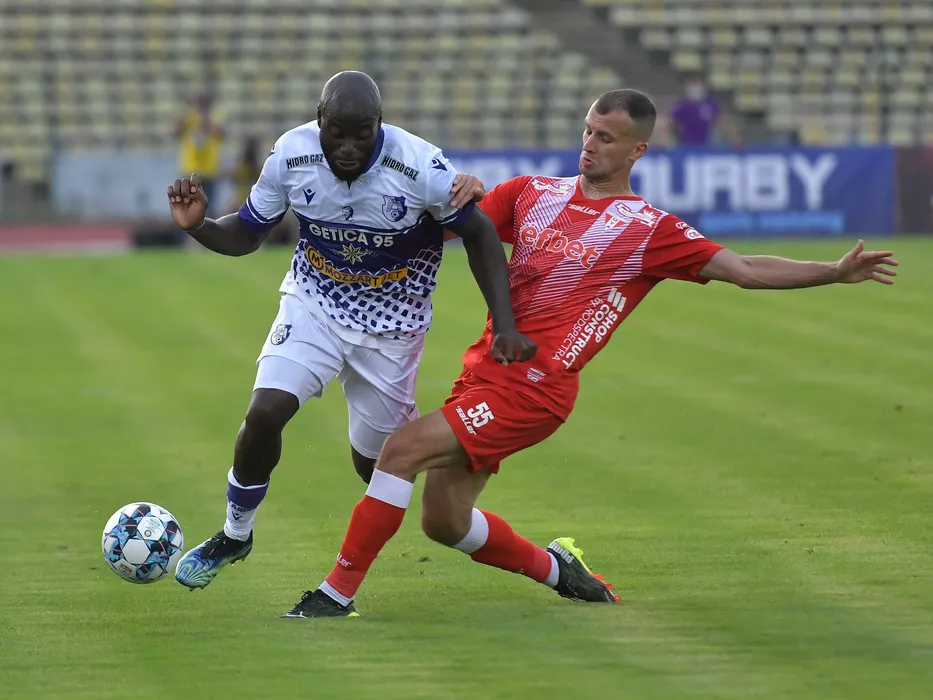 Joaquim Manuel Welo Lupeta si Evgenii Shliakov in meciul de fotbal dintre FC Arges si UTA Arad, contand pentru Liga 1 Casa Pariurilor, desfasurat pe Stadionul Nicolae Dobrin din Pitesti, sambata 23 iulie 2021. © FOTO:Razvan Pasarica/SPORT PICTURES