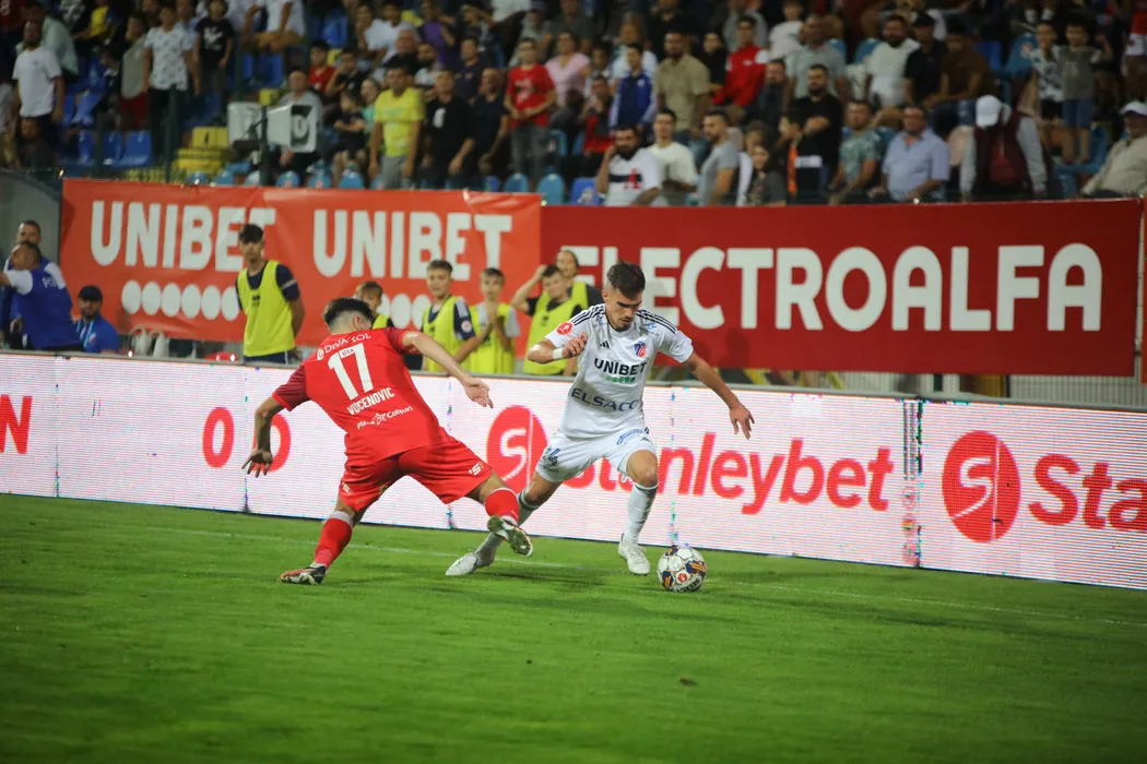 Marius Cioiu si Alekxandar Vucenovic in meciul de fotbal dintre FC BOTOSANI si UTA ARAD, contand pentru Superliga Superbet, desfasurat pe Stadionul Municipal din Botosani, sambata 23 septembrie 2023. © FOTO: Ionut Tabultoc/SPORT PICTURES