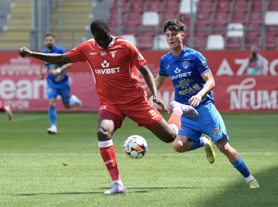 Ibrahima Sory Conte si Florin Alin Buda in meciul de fotbal dintre UTA Arad si Gloria Buzau, contand pentru Superliga Superbet Play-Out, desfasurat pe Arena Francisc Neuman din Arad, sambata 17 mai 2025. © FOTO: Alexandra Fechete/SPORT PICTURES
