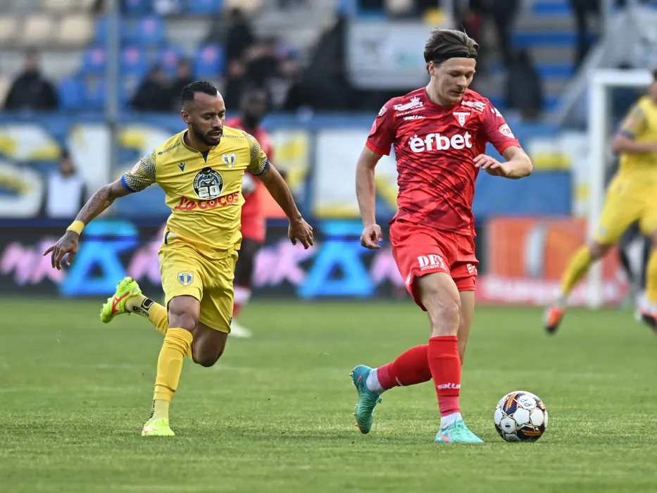 Jair Silva Tavares si Marko Stolnik in meciul de fotbal dintre Petrolul Ploiesti si UTA Arad, din cadrul Play out-ului Superligii Superbet, desfasurat pe Stadionul Ilie Oana din Ploiesti, luni 22 aprilie 2024. © FOTO:Razvan Pasarica/SPORT PICTURES