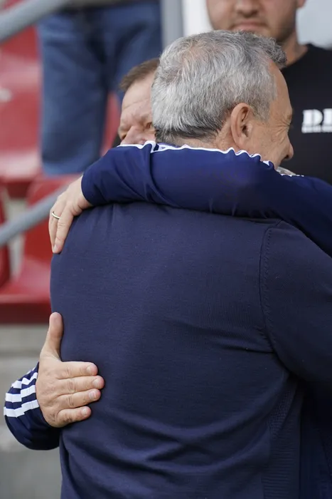 Cei doi antrenori Mircea Rednic și Dorinel Ionel Munteanu se salută înaintea meciului de fotbal dintre UTA Arad si SC Oțelul Galați, contând pentru Superliga Superbet Play-Out, desfășurat pe Arena Francisc Neuman din Arad, joi 25 aprilie 2024. © FOTO: Alexandra FECHETE/SPORT PICTURES