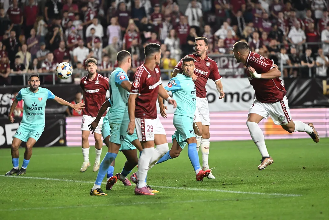 Denis Ciobotariu marchează un gol de lângă Benjamin Andre P Van Durmen, Hakim Djamel Abdallah, Alexandru Constantin Benga si Lars Kramer in meciul de fotbal dintre Rapid Bucuresti si UTA Arad, din cadrul Superligii Superbet, desfasurat pe Superbet Arena-Giulesti din Bucuresti, vineri 29 august 2025. © FOTO:Razvan Pasarica/SPORT PICTURES