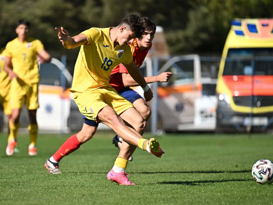 Ioan Vermesan marcheaza un gol in meciul de fotbal dintre Romania U19 si Spania U19, din cadrul turneului de pregatire UEFA, desfasurat pe Terenul central al Centrului National de Fotbal de la Mogosoaia, marti 15 octombrie 2024. © FOTO:Razvan Pasarica/SPORT PICTURES