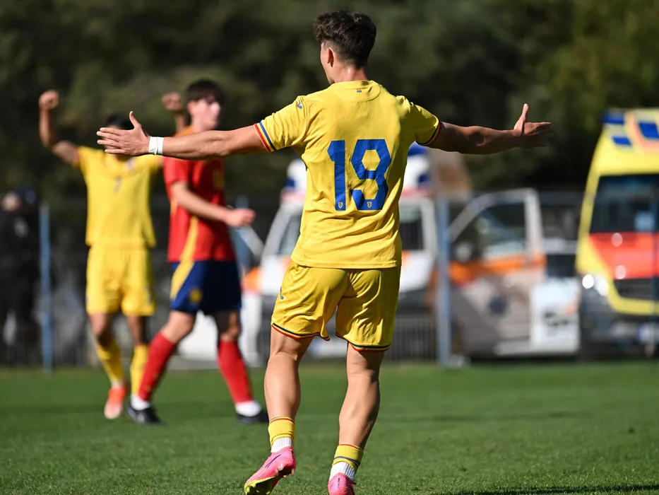 Ioan Vermesan se bucura dupa un gol marcat in meciul de fotbal dintre Romania U19 si Spania U19, din cadrul turneului de pregatire UEFA, desfasurat pe Terenul central al Centrului National de Fotbal de la Mogosoaia, marti 15 octombrie 2024. © FOTO:Razvan Pasarica/SPORT PICTURES