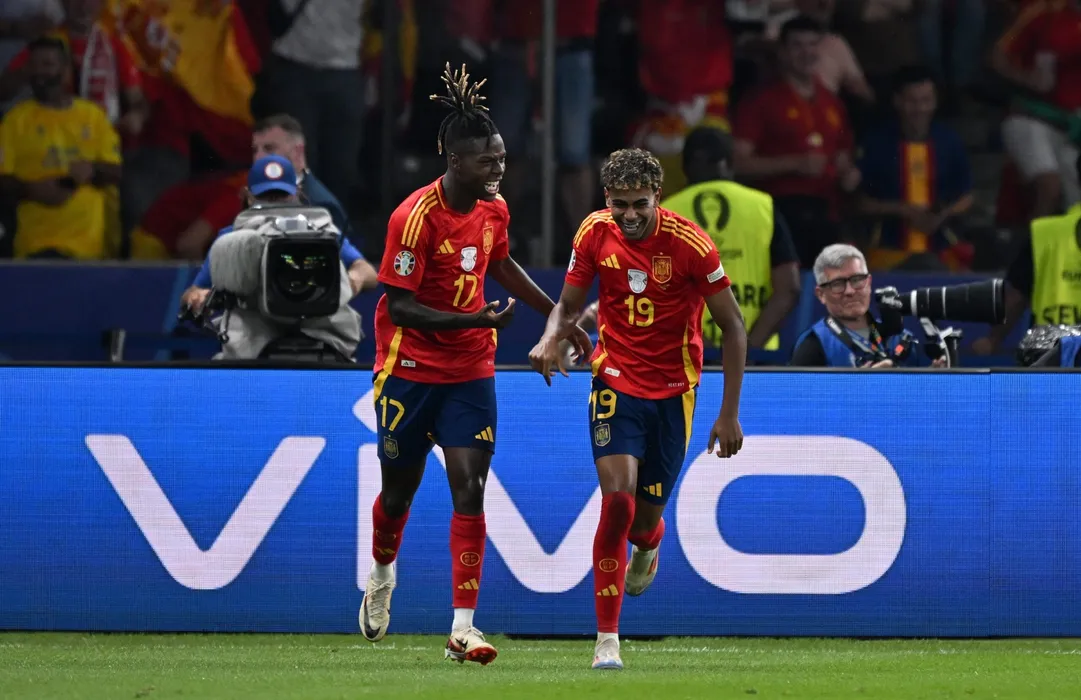 BERLIN, GERMANY - JULY 14: Nico Williams (17) of Spain celebrates after scoring a goal with his teammate Lamine Yamal (19) during the UEFA EURO 2024 final match between Spain and England at Olympiastadion in Berlin, Germany on July 14, 2024. Hesham Elsherif / Anadolu/ABACAPRESS.COM