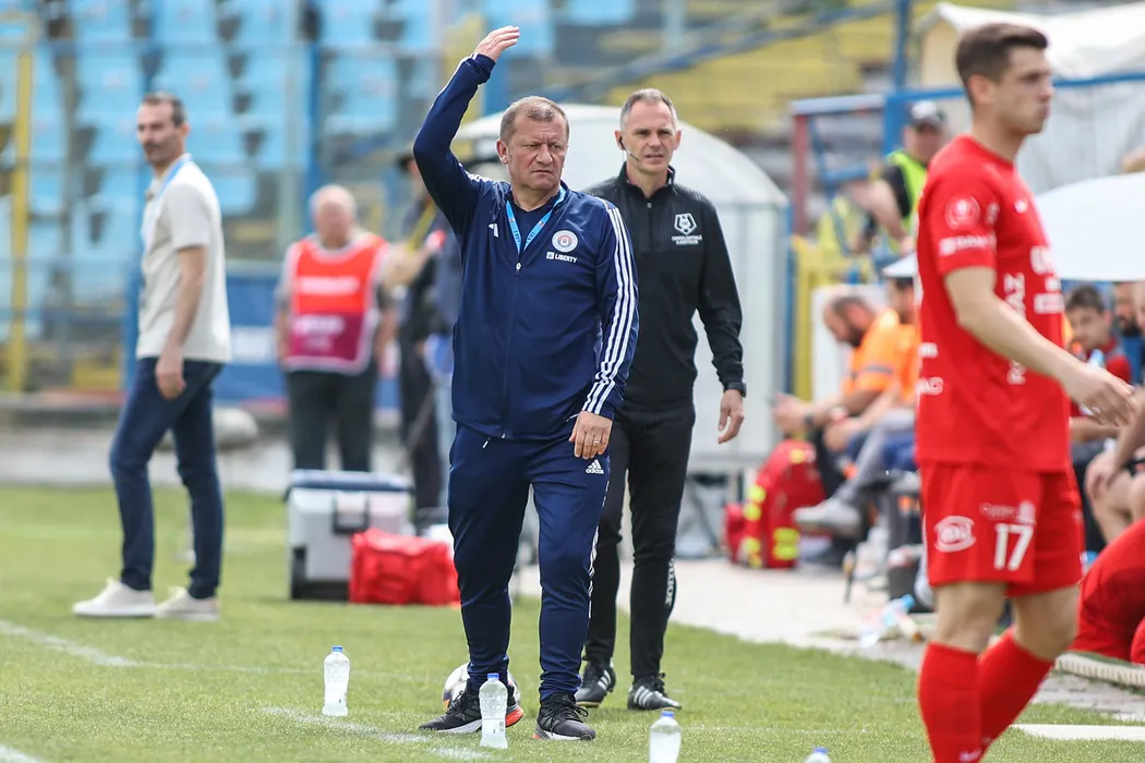 Dorinel Ionel Munteanu reacționează în meciul de fotbal dintre SC Oțelul Galați si AFC Hermannstadt Sibiu, contând pentru Superliga Superbet Play-out, desfășurat pe Stadionul Oțelul din Galați, duminică 28 aprilie 2024. © FOTO: Sorin PANĂ/SPORT PICTURES