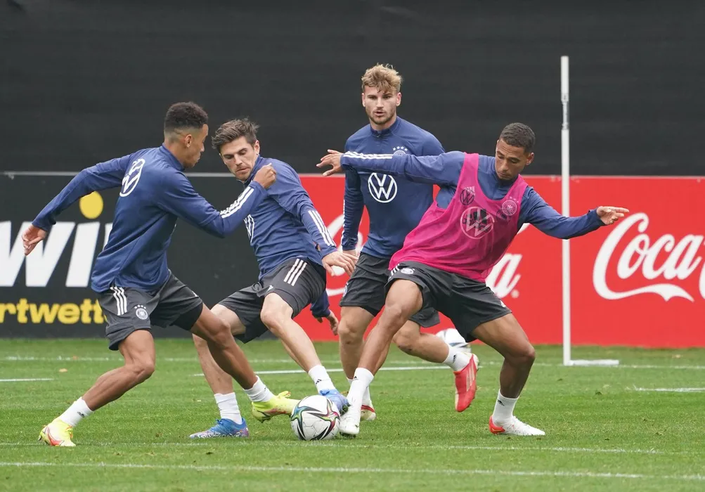 05 October 2021, Hamburg: Football: National team, training before the World Cup qualifier against Romania. Germany's Jamal Musiala, Jonas Hofmann, Timo Werner and Thilo Kehrer (l-r) in action. Photo: Marcus Brandt/dpa,Image: 636671281, License: Rights-managed, Restrictions: GERMANY OUT, Model Release: no, Credit line: Profimedia