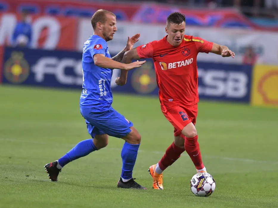 Modestas Vorobjovas si Vadim Rata in meciul de fotbal dintre FCSB si Chindia Targoviste, contand pentru Superliga Superbet, desfasurat pe Arena Nationala din Bucuresti, duminica 14 august 2022. © FOTO:Razvan Pasarica/SPORT PICTURES