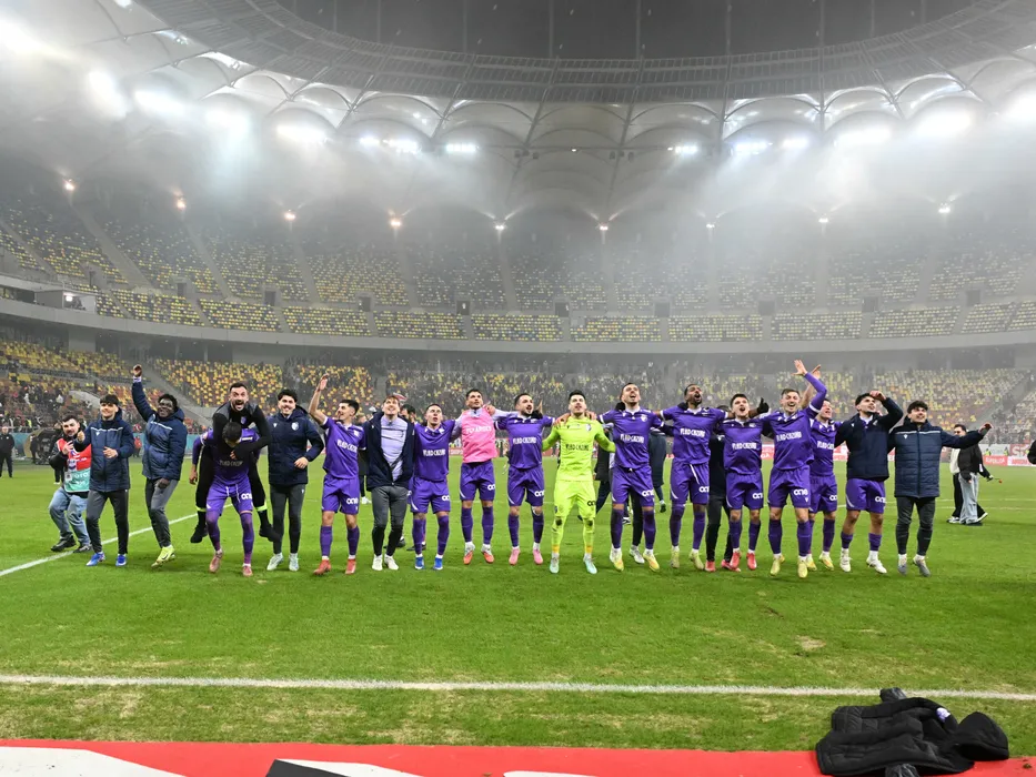 Fotbalistii argeseni printre care Mario Cristian Tudose, Costinel Andrei Tofan, Ricardo Manuel Pinho Matos, Robert Marian Moldoveanu, Laurentiu Ionut Radescu, Gabriel Dorinel Oancea, Abdel Bettaieb, Takayuki Seto, Claudiu Valentin Micovschi si Vadim Rata alături de tabela de marcaj saluta galeria dupa meciul de fotbal dintre Dinamo Bucuresti si FC Arges, din cadrul Superligii Superbet, desfasurat pe Arena Nationala din Bucuresti, duminica 1 martie 2026. © FOTO:Razvan Pasarica/SPORT PICTURES