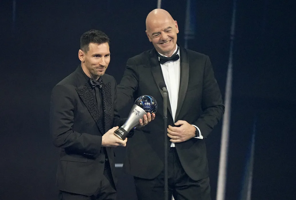 Argentina's Lionel Messi receives the Best FIFA Men's player award during the ceremony of the Best FIFA Football Awards in Paris, France, Monday, Feb. 27, 2023. (AP Photo/Michel Euler)
