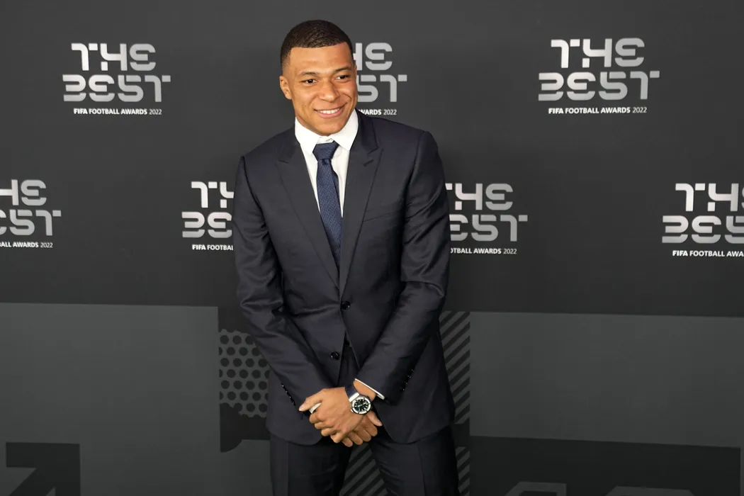 France's Kylian Mbappe poses on the green carpet before the ceremony of the Best FIFA Football Awards in Paris, France, Monday, Feb. 27, 2023. (AP Photo/Michel Euler)