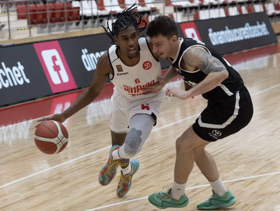 Dalan Chand Ancrum și Anton Grigorie Rotaru în meciul de baschet dintre CS Dinamo București și CS Vâlcea 1924, contând pentru Liga Națională de Baschet Masculin GETICA 95, desfășurat în Sala Dinamo din București, duminică 20 octombrie 2024. © FOTO: Mihai NEACȘU/SPORT PICTURES