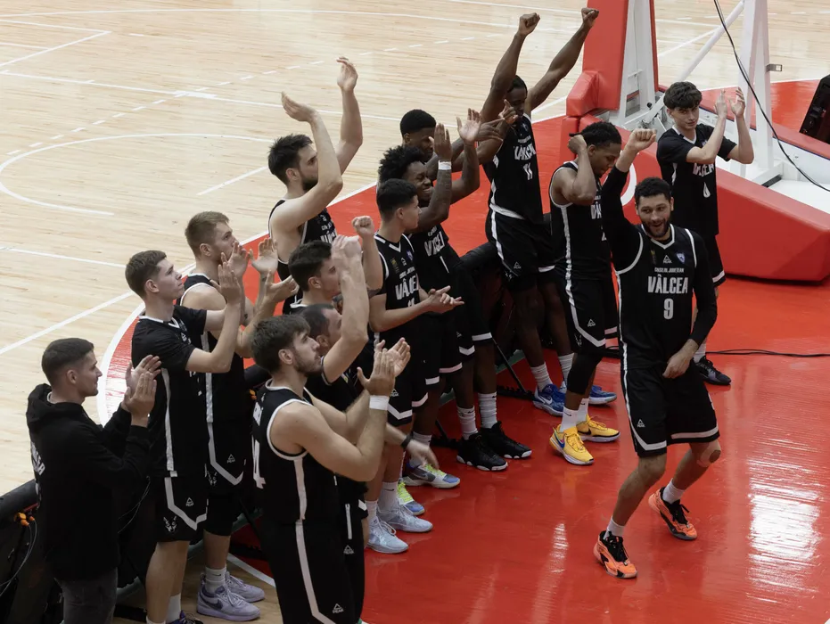 Baschetbaliștii vâlceni salută suporterii după victoria obținută în meciul de baschet dintre CS Dinamo București și CS Vâlcea 1924, contând pentru Liga Națională de Baschet Masculin GETICA 95, desfășurat în Sala Dinamo din București, duminică 20 octombrie 2024. © FOTO: Mihai NEACȘU/SPORT PICTURES