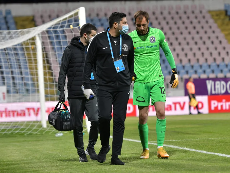 Valentin Alexandru Cojocaru paraseste terenul accidentat in meciul de fotbal dintre Chindia Targoviste si Viitorul Constanta, contand pentru Play-out-ul Ligii 1 Casa Pariurilor, desfasurat pe Stadionul Gloria din Buzau, vineri 14 mai 2021. © FOTO:Razvan Pasarica/SPORT PICTURES
