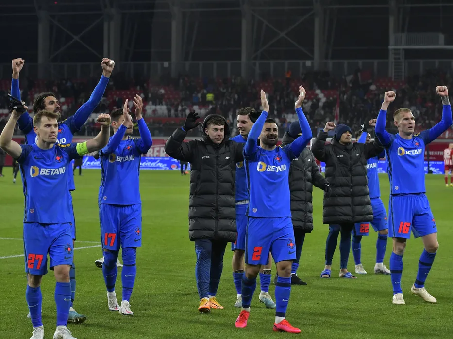 Fotbalistii stelisti Darius Dumitru Olaru,Andrea Compagno, Eduard Gabriel Radaslavescu,Valentin Cretu,David Raul Miculescu,Florinel Teodor Coman si Joonas Tamm saluta galeria dupa meciul de fotbal dintre Sepsi OSK Sfantu Gheorghe si FCSB, contand pentru Play-off-ul Superligii Superbet, desfasurat pe Sepsi Arena din Sfantu Gheorghe, luni 3 aprilie 2023. © FOTO:Razvan Pasarica/SPORT PICTURES