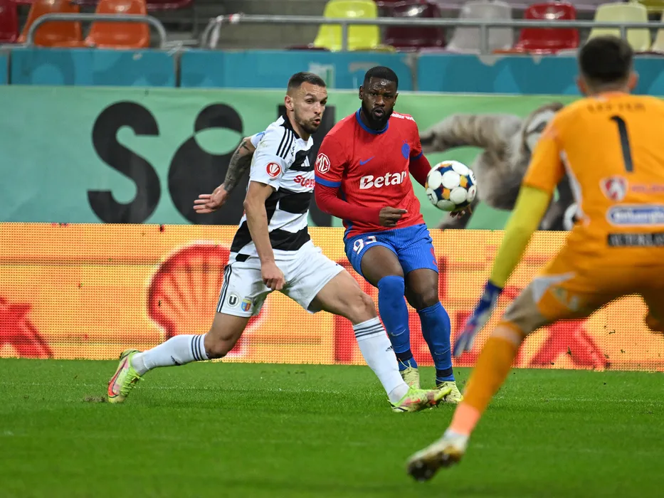 Dino Mikanovic si Mamadou Thiam in meciul de fotbal dintre FCSB si Universitatea Cluj, contand pentru Superliga Superbet, desfasurat pe Arena Nationala din Bucuresti, sambata 7 martie 2026. © FOTO:Razvan Pasarica/SPORT PICTURES