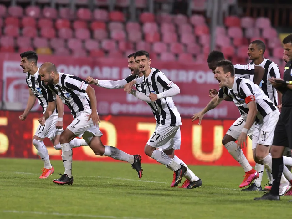 Fotbalistii de la Astra Valentin Gheorghe, Dario Canadija, Momcilo Raspopovic, Albert Tivadar Stahl, Daniel Graovac si Yann Laye Boe Kane se bucura dupa meciul de fotbal dintre Dinamo Bucuresti si Astra Giurgiu, contand pentru semifinala retur a Cupei Romaniei, desfasurat fara spectatori pe Stadionul Dinamo din Bucuresti, marti 11 mai 2021. © FOTO:Razvan Pasarica/SPORT PICTURES