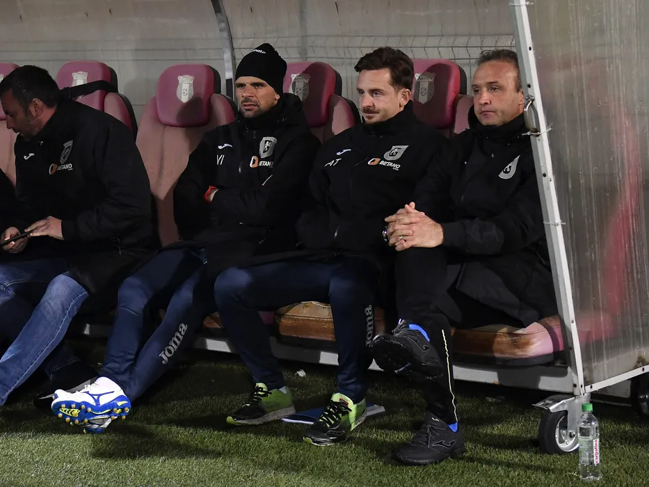 Cornel Papura si Valentin Iliev pe banca Craiovei in meciul de fotbal dintre Astra Giurgiu si Universitatea Craiova, din cadrul playoff-ului Ligii 1 Betano, desfasurat pe Stadionul Marin Anastasovici din Giurgiu, vineri 19 aprilie 2019. © FOTO:Razvan Pasarica/SPORT PICTURES