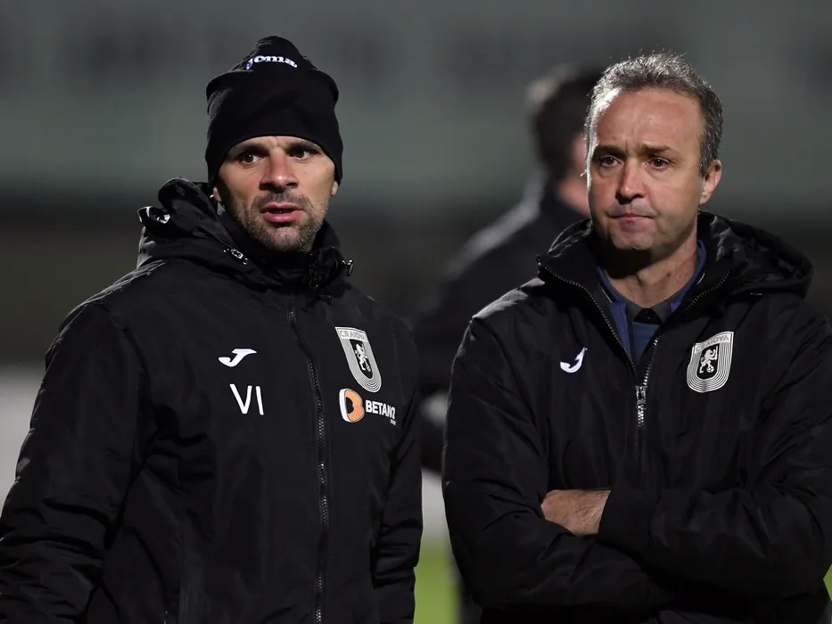 Valentin Iliev si Cornel Papura in meciul de fotbal dintre Astra Giurgiu si Universitatea Craiova, din cadrul playoff-ului Ligii 1 Betano, desfasurat pe Stadionul Marin Anastasovici din Giurgiu, vineri 19 aprilie 2019. © FOTO:Razvan Pasarica/SPORT PICTURES