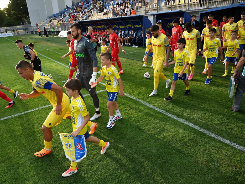 Cele doua echipe cu Valentin Constantin Ticu, Lukas Zimasi Paul Papp ies pe teren la meciul de fotbal dintre Petrolul Ploiesti si FC Hermannstadt, din cadrul Superligii Superbet, desfasurat pe Stadionul Ilie Oana din Ploiesti, duminica 24 septembrie 2023. © FOTO:Razvan Pasarica/SPORT PICTURES