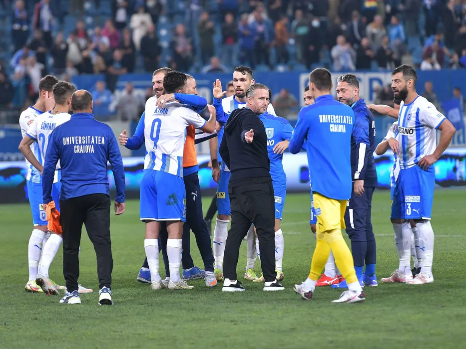 Bucurie a fotbalistilor craioveni Mihai Alexandru Balasa, Valerica Marius Gaman si Marius Marcel Constantin alaturi de Laurentiu Aurelian Reghecampf dupa meciul de fotbal dintre Universitatea Craiova si Dinamo Bucuresti, contand pentru Liga 1 Casa Pariurilor, desfasurat pe Stadionul Ion Oblemenco din Craiova, luni 27 septembrie 2021. © FOTO:Razvan Pasarica/SPORT PICTURES