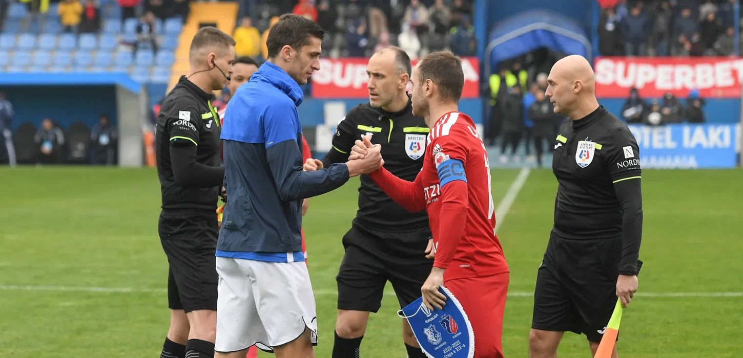 Brigada de arbitrii formata din George Florin Neacsu, Viorel Nicusor Flueran si Ionel Valentin Dumitru alaturi de capitanii Ionut Justinian Larie si Andrei Alexandru Patache in meciul de fotbal dintre Farul Constanta si FC Botosani, contand pentru Superliga Superbet, desfasurat pe Stadionul central al Academiei Gheorghe Hagi din Ovidiu, duminica 4 decembrie 2022. © FOTO:Razvan Pasarica/SPORT PICTURES