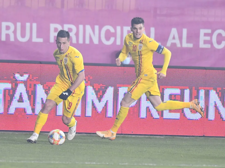 Olimpiu Morutan si Ianis Hagi in meciul de fotbal dintre Romania U21 si Danemarca U21, din cadrul Preliminariilor Campionatului European din 2021, desfasurat fara spectatori pe Stadionul Ilie Oana din Ploiesti, marti 17 noiembrie 2020. © FOTO:Razvan Pasarica/SPORT PICTURES