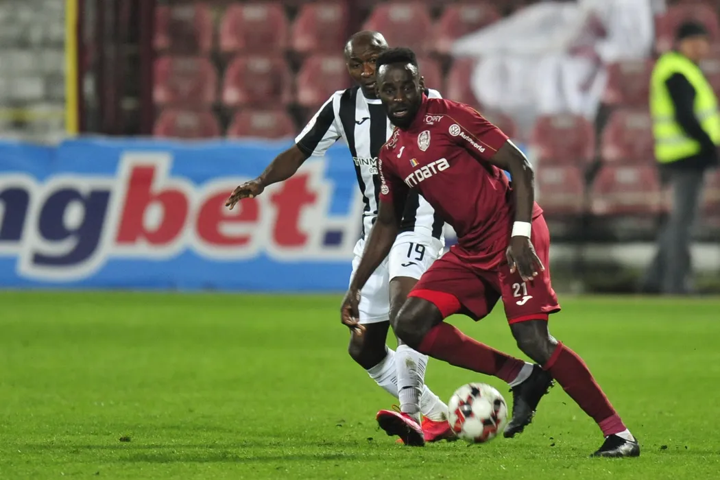 Kevin Boli (D), de la CFR Cluj, suteaza in timpul meciului de fotbal contra echipei AFC Astra , din prima etapa a play - off - ului Ligii 1, disputat la stadionul Constantin Radulescu din Cluj Napoca, luni, 2 martie 2020. DAN HORIA TAUTAN / MEDIAFAX FOTO