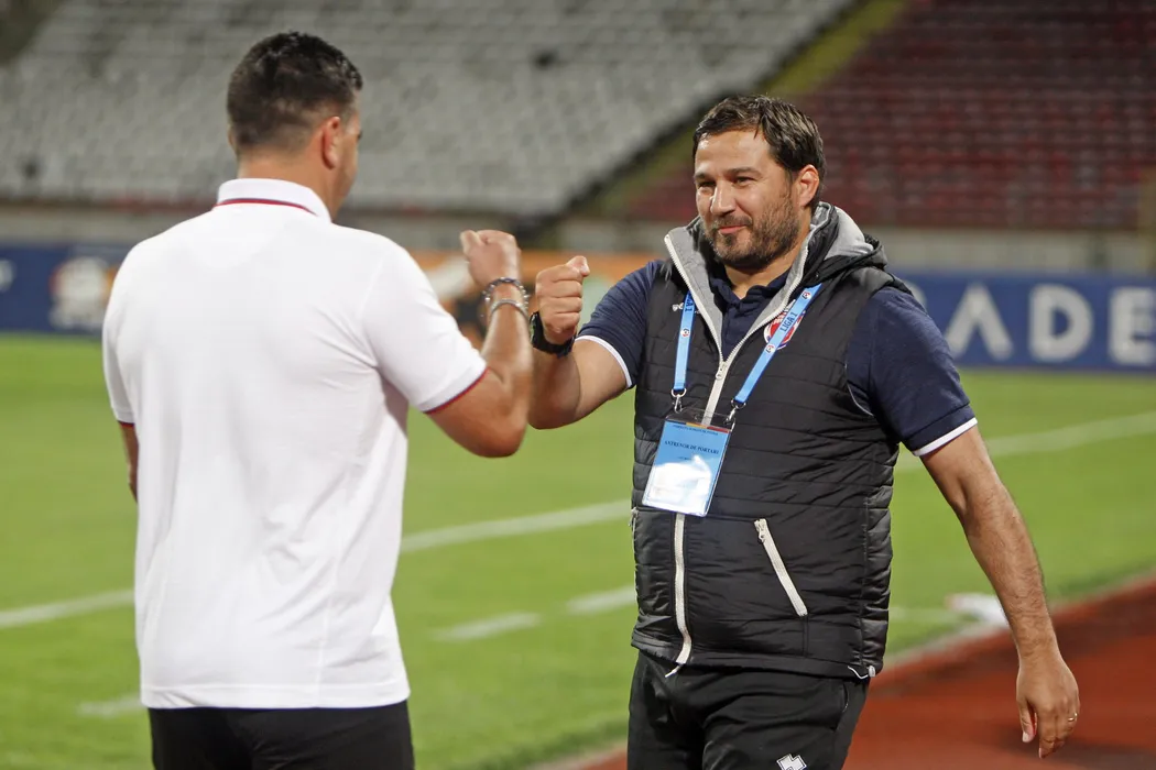 Cosmin Contra (S), antrenorul echipei Dinamo, si Marius Croitoru (D), antrenorul echipei FC Botosani, se saluta inainte de inceperea meciului de fotbal din etapa a III-a a Ligii 1, disputat pe stadionul Dinamo din Bucuresti, vineri, 11 septembrie 2020. SPORT PIC / MEDIAFAX FOTO