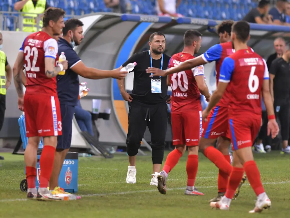 Marius Croitoru alaturi de fotbalistii botoseneni la o pauza de hidratae in meciul de fotbal dintre Universitatea Craiova si FC Botosani, contand pentru Liga 1 Casa Pariurilor, desfasurat pe Stadionul Ion Oblemenco din Craiova, duminica 1 august 2021. © FOTO:Razvan Pasarica/SPORT PICTURES
