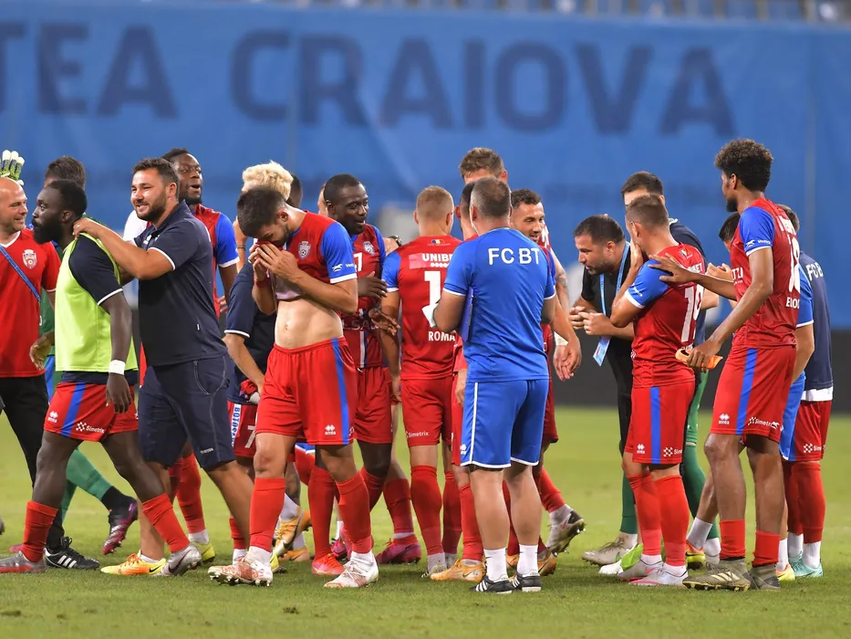 Fotbalistii botoseneni se bucura alaturi de Marius Croitoru dupa meciul de fotbal dintre Universitatea Craiova si FC Botosani, contand pentru Liga 1 Casa Pariurilor, desfasurat pe Stadionul Ion Oblemenco din Craiova, duminica 1 august 2021. © FOTO:Razvan Pasarica/SPORT PICTURES