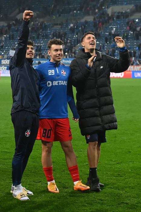 Fotbalistii stelisti Florinel Teodor Coman, Eduard Gabriel Radaslavescu si David Raul Miculescu saluta galeria dupa meciul de fotbal dintre Universitatea Craiova si FCSB, contand pentru Play-off-ul Superligii Superbet, desfasurat pe Stadionul Ion Oblemenco din Craiova, duminica 30 aprilie 2023. © FOTO:Razvan Pasarica/SPORT PICTURES