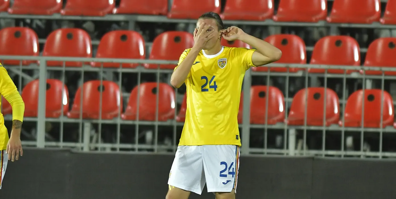 Denis Giafer se bucura dupa un gol marcat in meciul amical de fotbal dintre Romania U20 si Cehia U20, desfasurat pe Stadionul Anghel Iordanescu din Voluntari, joi 7 octombrie 2021. © FOTO:Razvan Pasarica/SPORT PICTURES