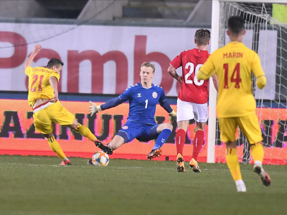 Ionut Valentin Costache si Oliver Christensen in meciul de fotbal dintre Romania U21 si Danemarca U21, din cadrul Preliminariilor Campionatului European din 2021, desfasurat fara spectatori pe Stadionul Ilie Oana din Ploiesti, marti 17 noiembrie 2020. © FOTO:Razvan Pasarica/SPORT PICTURES
