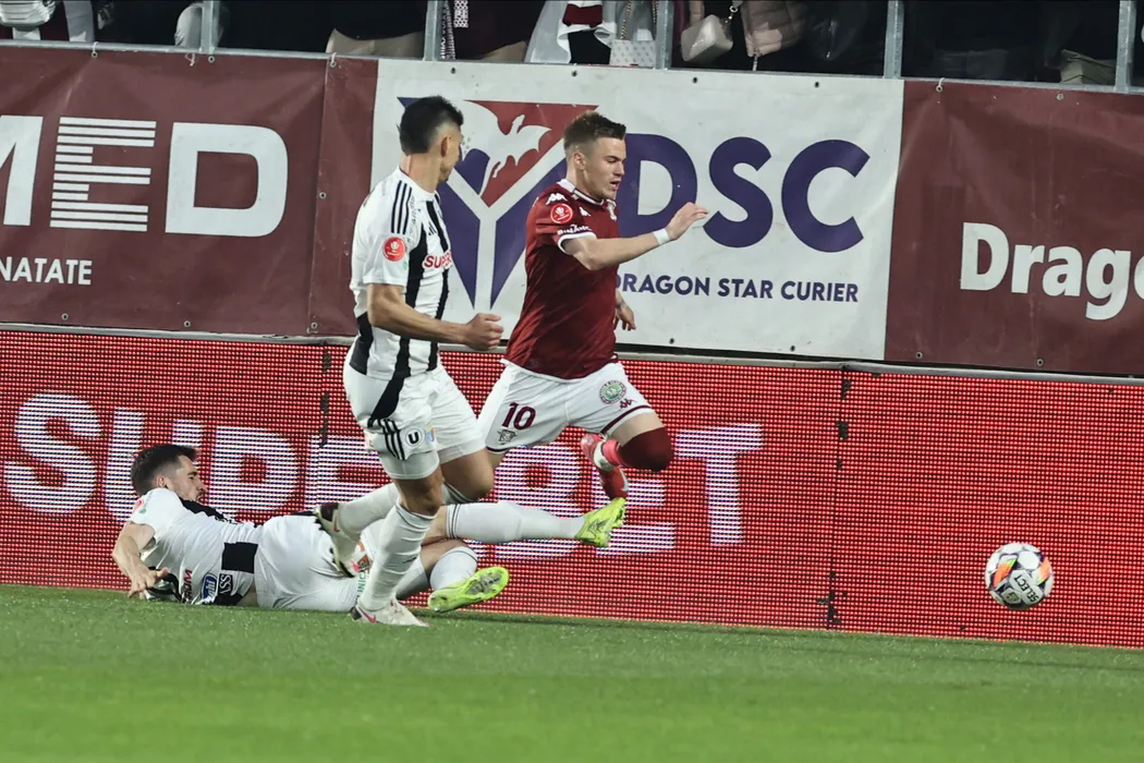Claudiu Adrian Mihai Petrila si Lucian Iulian Cristea, Dorin Marian Codrea in meciul de fotbal dintre FC Rapid 1923 Bucuresti si FC Universitatea Cluj, din cadrul Superligii Superbet - Play-Off, desfasurat pe Superbet Arena-Giulesti din Bucuresti, sambata 19 aprilie 2025. © FOTO: Gheorghe Fluster/SPORT PICTURES
