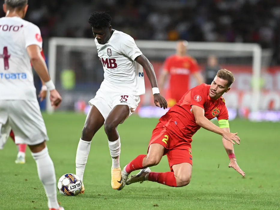 Emmanuel Yeboah si Darius Dumitru Olaru in meciul de fotbal dintre FCSB si CFR Cluj, din cadrul Superligii Superbet, desfasurat pe Stadionul Steaua-Ghencea din Bucuresti, duminica 6 august 2023. © FOTO:Razvan Pasarica/SPORT PICTURES