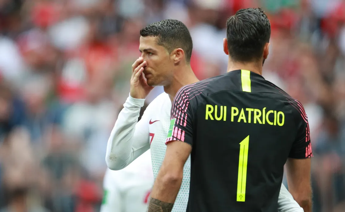 5544559 20.06.2018 Portugal's Cristiano Ronaldo, left, walks past Portugal's goalkeeper Rui Patricio during the World Cup Group B soccer match between Portugal and Morocco at the Luzhniki stadium, in Moscow, Russia, June 20, 2018. Anton Denisov / Sputnik/ Hepta / Sport Pictures