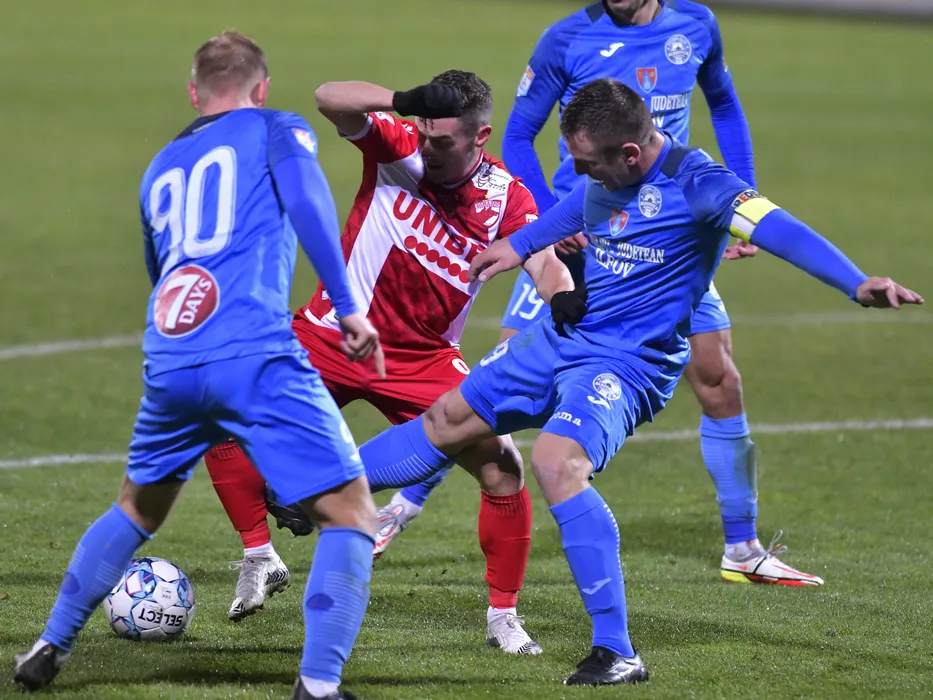 Gabriel Andrei Torje si Razvan Bogdan Patriche Nichita in meciul de fotbal dintre Academica Clinceni si Dinamo Bucuresti, contand pentru Liga 1 Casa Pariurilor, desfasurat pe Stadionul Marin Anastasovici din Giurgiu, vineri 3 decembrie 2021. © FOTO:Razvan Pasarica/SPORT PICTURES