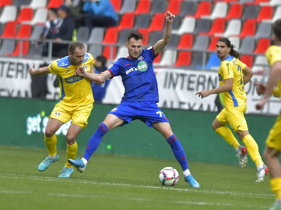 Eugeniu Cebotaru si Remus Bogdan Chipirliu in meciul de fotbal dintre Steaua Bucuresti si Petrolul Ploiesti, contand pentru Play-off-ul Ligii a-2-a Casa Pariurilor, desfasurat pe Stadionul Steaua-Ghencea din Bucuresti, sambata 2 aprilie 2022. © FOTO:Razvan Pasarica/SPORT PICTURES