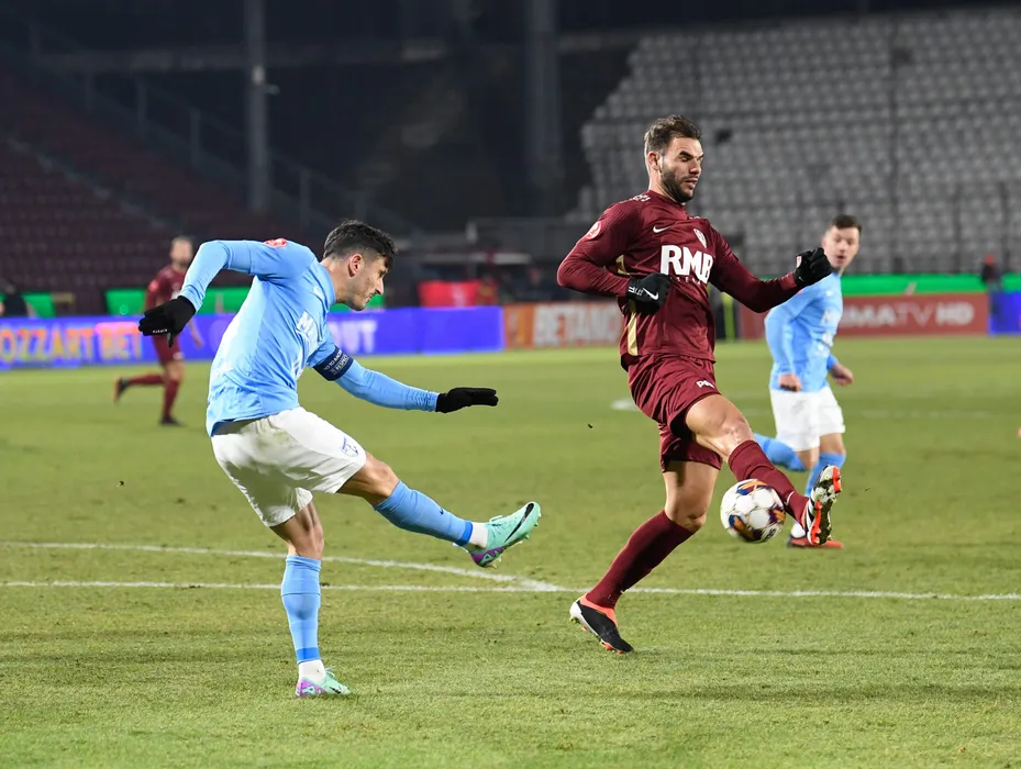 Ricardo Jose Veiga Varzim Miranda și Panagiotis Tachtsidis în meciul de fotbal dintre FC CFR 1907 Cluj SA si SC FC Voluntari SA, contând pentru Superliga Superbet, desfășurat pe Stadionul Dr.Constantin Rădulescu din Cluj-Napoca, luni 29 ianuarie 2024. © FOTO: Flaviu BUBOI/SPORT PICTURES
