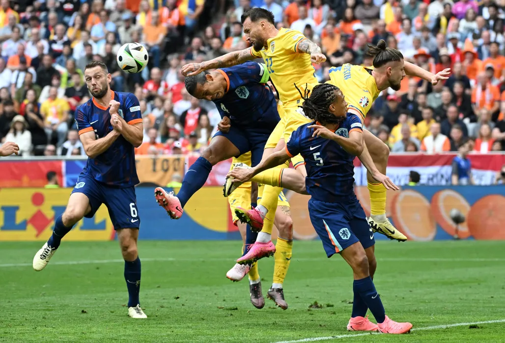 02 July 2024, Bavaria, Munich: Netherlands' Virgil Van Dijk (2nd L) and Romania's Vasile Mogos battle for the ball during the UEFA Euro 2024 round of 16 soccer match between Romania and The Netherlands at the Allianz Arena. Photo: Sven Hoppe/dpa