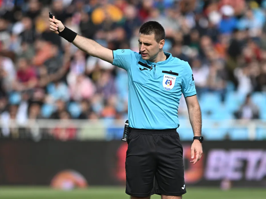 Arbitrul central Rares George Vidican reacționează in meciul de fotbal dintre Otelul Galati si Universitatea Cluj, din cadrul Play-out-ului Superligii Superbet, desfasurat pe Stadionul Otelul din Galati, duminica 21 aprilie 2024. © FOTO:Razvan Pasarica/SPORT PICTURES