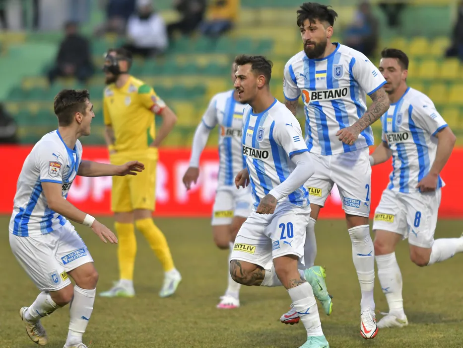 Bucurie a fotbalistilor craioveni dupa un gol marcat cu Paul Papp, Jovan Markovic si Bogdan Ilie Vatajelu in meciul de fotbal dintre CS Mioveni si Universitatea Craiova, contand pentru Liga 1 Casa Pariurilor, desfasurat pe Stadionul Orasenesc din Mioveni, miercuri 2 martie 2022. © FOTO:Razvan Pasarica/SPORT PICTURES
