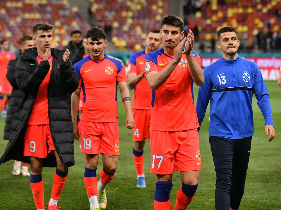 Fotbalistii stelisti Iulian Lucian Cristea si Ioan Andrei Vasile Dumiter saluta galeria dupa meciul de fotbal dintre FCSB si FC Arges, contand pentru Play-off-ul Ligii 1 Casa Pariurilor, desfasurat pe Arena Nationala din Bucuresti, luni 2 mai 2022. Bucuresti *** Steaua football players Iulian Lucian Cristea and Ioan Andrei Vasile Dumiter greet the gallery after the football match between FCSB and FC Arges, counting for the Play off of League 1 Casa Pariurilor, held on the National Arena in Bucharest, Monday, May 2, 2022 Bucharest Copyright: xRazvanxPasarica/SPORTxPICTURESx