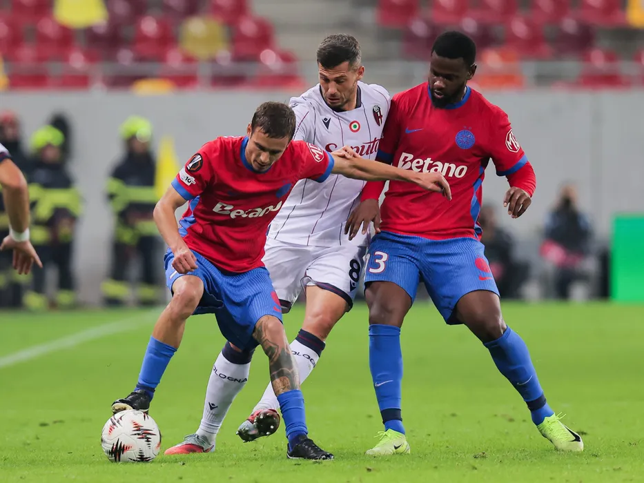 Juri Cisotti, Mamadou Thiam si Riccardo Orsolini in meciul de fotbal dintre FCSB si Bologna FC, contand pentru Europa League, desfasurat la Arena Nationala din Bucuresti, joi 23 octombrie 2025. © FOTO:Mihai-Antonio Vasile/SPORT PICTURES