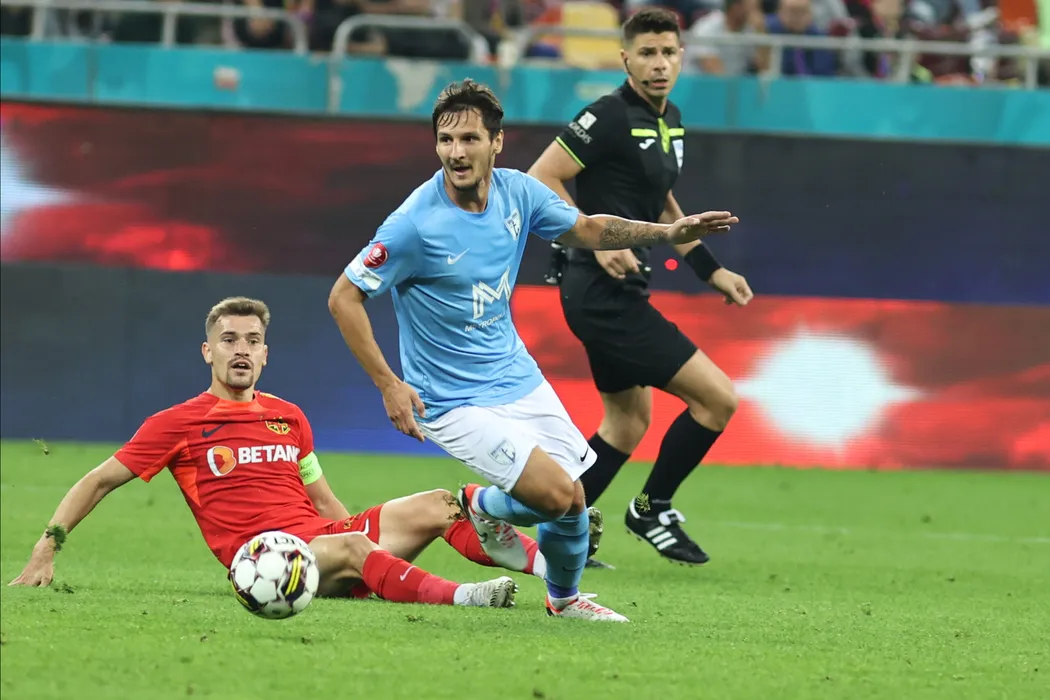 Darius Dumitru Olaru și Ljuban Crepulja în meciul de fotbal dintre FCSB și FC VOLUNTARI, contând pentru SUPERLIGA SUPERBET, desfășurat pe Stadionul Arena Națională din București, duminică 22 octombrie 2023. © FOTO: Gică FLUȘTER/SPORT PICTURES
