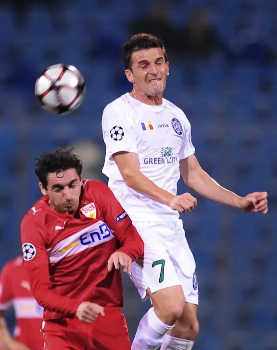Roberto Hilbert (L) of VfB Stuttgart vies for the ball against Marius Ioan Bilasco (R) of Unirea Urziceni during Champions League football match in Bucharest on September 29, 2009. AFP PHOTO DANIEL MIHAILESCU,Image: 38908916, License: Rights-managed, Restrictions: , Model Release: no