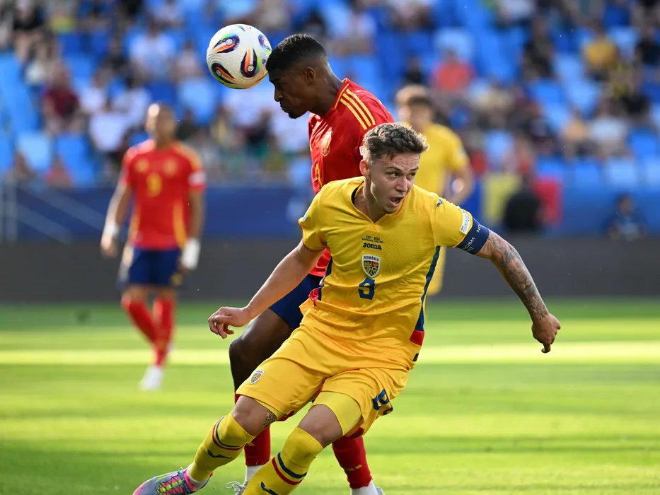 Cristian Mosquera si Louis Munteanu in meciul de fotbal dintre Spania U21 si Romania U21, din cadrul UEFA EURO U21 din Slovacia, desfasurat pe Stadionul National de fotbal din Bratislava, sambata 14 iunie 2025. © FOTO:Razvan Pasarica/SPORT PICTURES